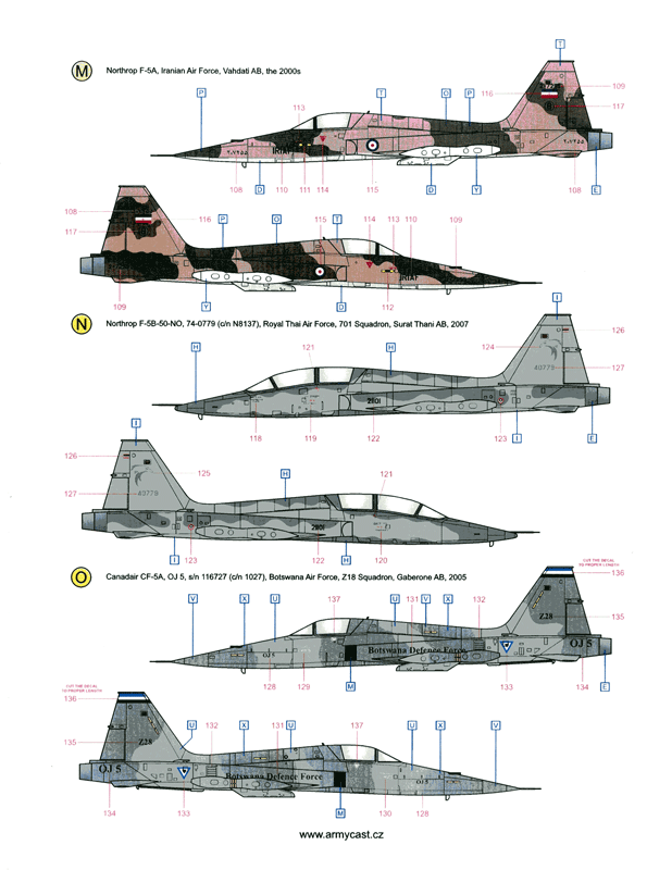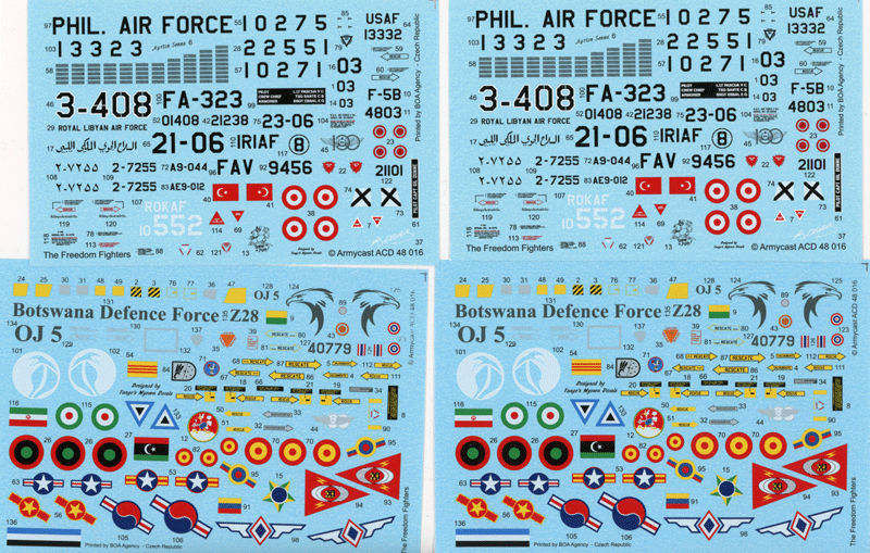 A whole raft of F-5's on this sheet from Brazil, Libya, Kenya, Vietnam, Spain, Venezuela, Philippines, South Korea, Iran, Thailand and Botswana