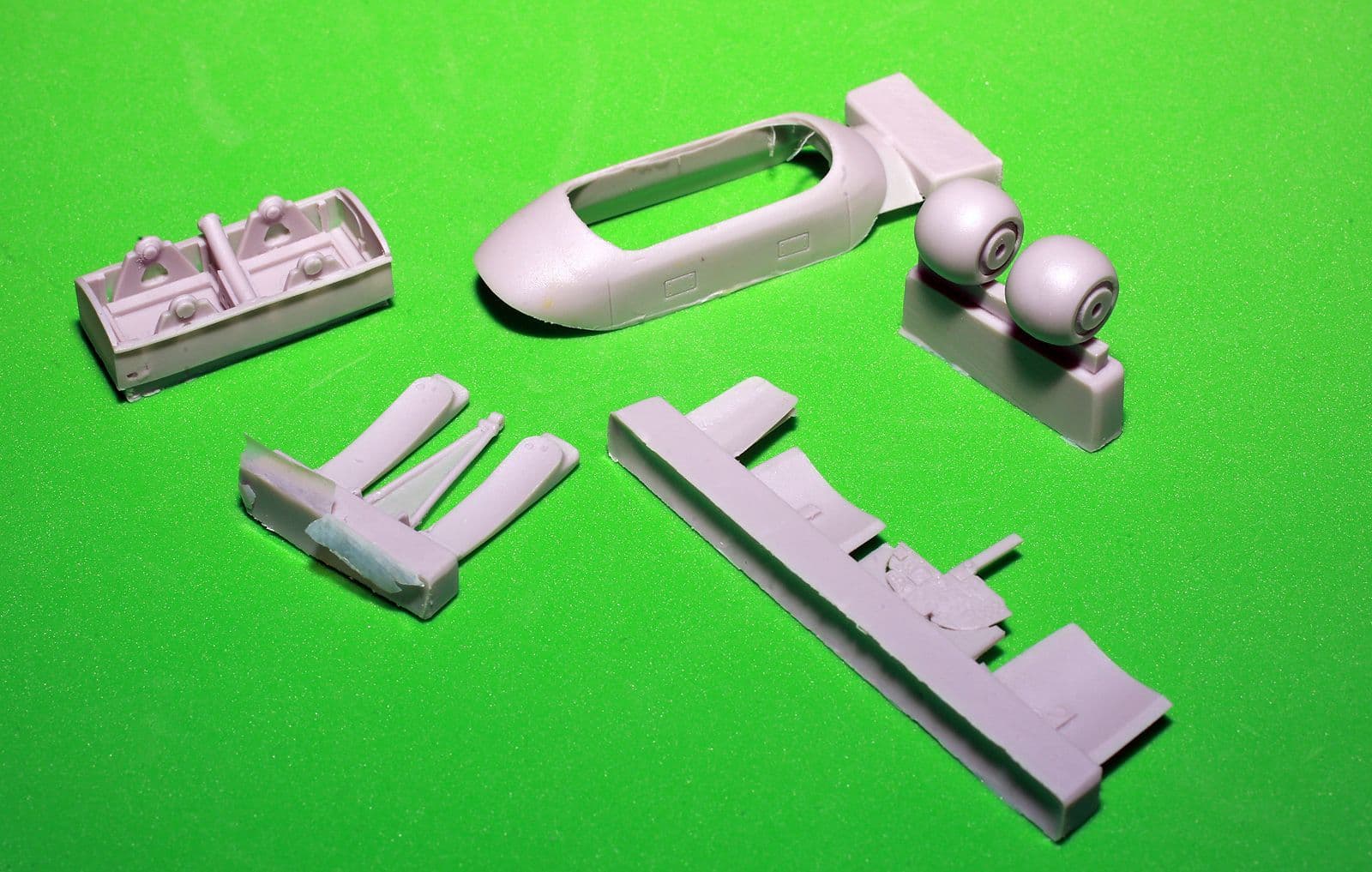 Resin bomb bay, bombs, instrument panel plus arestor gear and propellers for two variants of this special aircraft